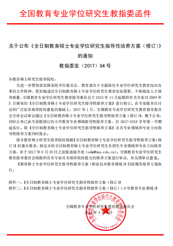 全日制教育硕士专业学位研究生指导性培养方案(修订)(教指委发[2017]04号)