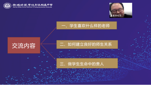 讲座中,周校长针对新教师如何处理师生关系,依次从学生喜欢什么样的老师、如何建立良好的师生关系和做学生生命中的贵人三个方面展开经验分析。首先,周校长通过共同观看视频故事《我的小学经历》与师范生畅谈,并总结道:亲和、健康、轻松、合作、创新的教师最受学生欢迎,温暖而坚毅的性格以及高效而先进的教学方法是魅力教师不可或缺的特点。