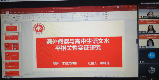 由于疫情原因,本次报告论证会通过腾讯会议在线上开展,参与本次会议的有:外请专家湖南师范大学学科教学(语文)学科负责人、教授张良田,衡阳市八中校长、语文中教正高教师文思源,衡阳市八中语文中教高级教师李自生;硕士研究生导师任美衡、李振中、朱迪光、左其福,研究生秘书文玲;文学院2019级研究生谭咏佳、陈瑶和李玉婕,以及2020级学科教学(语文)教育硕士部分研究生新生。报告会由文学院主管副院长李振中主持。