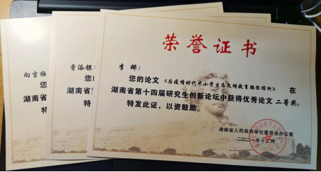 12月21日教育管理方向3位研究生在湖南省第十四届研究生创新论坛“教育改革与教学创新”分论坛上所提交的论文获二等奖1项、三等奖2项,其中:2020级教育管理方向李娜提交的论文《后疫情时代中小学生态文明路径探析》获二等奖2020级教育管理方向曹添银2021级教育管理向吉梅提交的论文分别获三等奖。向吉梅代表我院研究生现场参加了论坛活动。